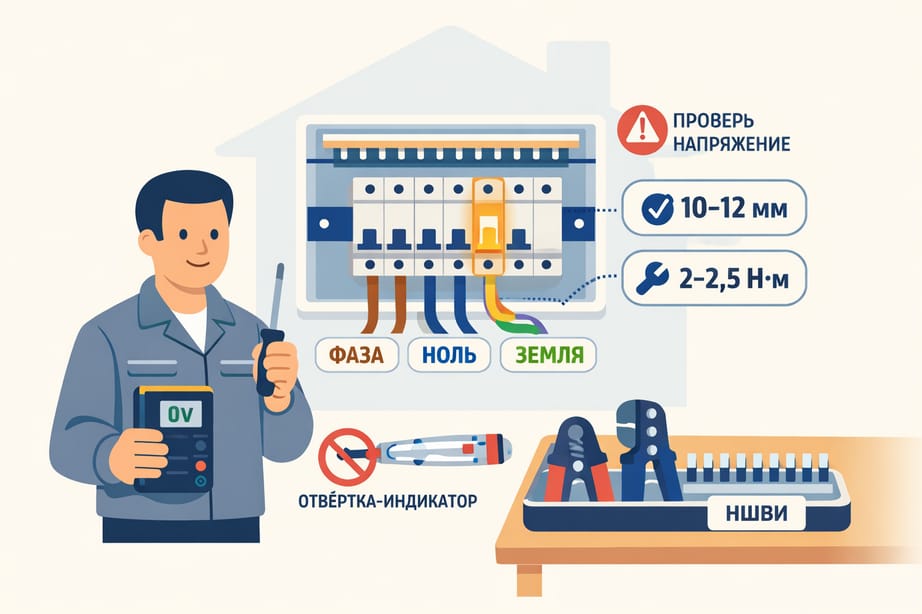 Снимите изоляцию на длину 10–12 мм — эта цифра часто нанесена прямо на боковой стенке корпуса автомата в виде шаблона. Используйте стриппер, а не нож: надрез жилы уменьшает реальное сечение провода и создаёт точку будущего излома. -